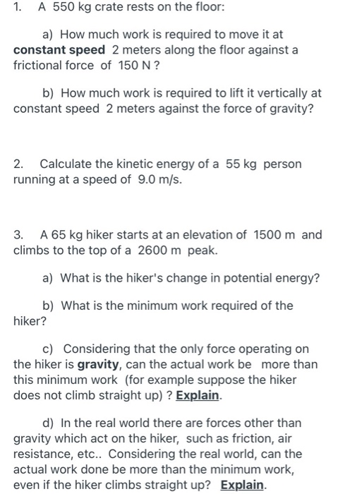 Here is all you need to read about calculate the work done by the hiker against gravity Solution Given mass of bottle 202 kilograms acceleration due to gravity 98 msec2 height 08 meter Relationship W mgh Work against gravity mass acceleration due to gravity height Wmgh Wmgh W 202 kg 98 msec 2 08 m W 158 joules. If is the angle made when the body falls the work done by gravity is given by W m g h cos. The negative sign shows that the particle is dropping from a height h vertically in the direction of gravity. Work and energy ppt video online download 1 a 550 kg crate rests on the floor a how much chegg work and energy work is the product of force and displacement the force needed to calculate work is the force or ponent force in the direction of ppt download chapter 6 work and energy units of chapter 6 work done a constant force work done a varying force kiic energy and the work energy principle ppt download chapter 7 work energy the course theme is solved a 65 kg hiker climbs to the top of a mountain 4200 m high the climb is made in 4 6 h starting at an elevation o The climb is made in 46 h starting at an elevation of 2800 m.